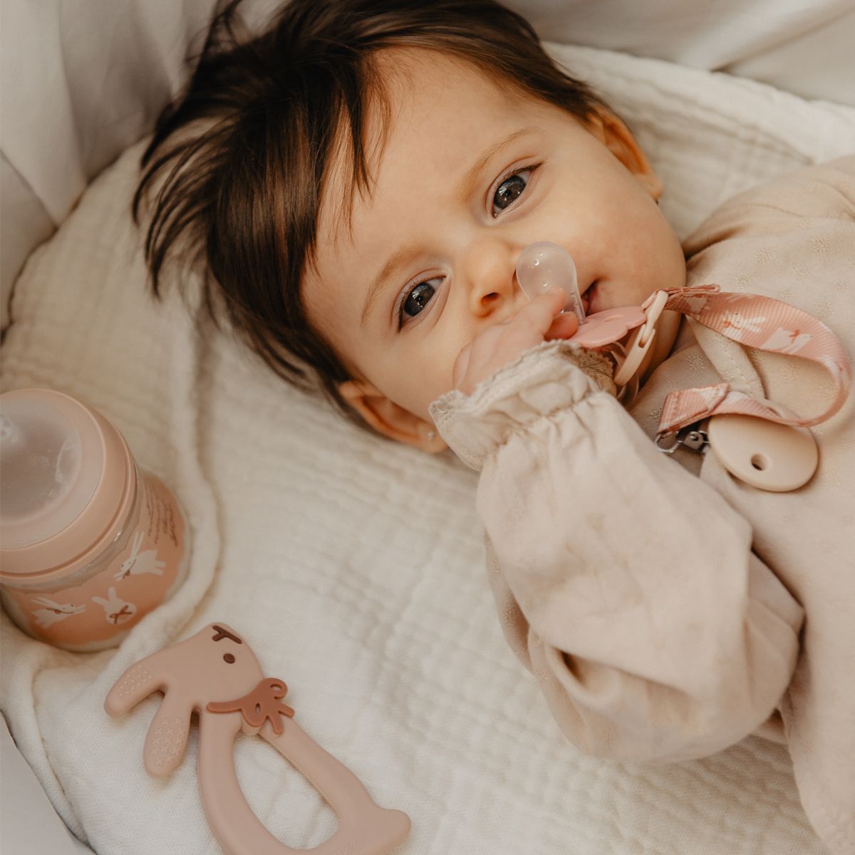• 1 textilný klip na cumlík, ktorý zabraňuje pádu alebo strate cumlíka
