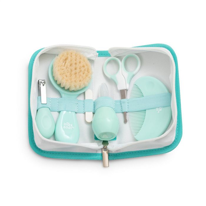 Praktická hygienická sada produktov pre starostlivosť o dieťa značky Interbaby obsahuje základné potreby pre každodennú starostlivosť o detské vlásky, nechty. Sada osahuje kefu s prírodnými štetinami, hrebeň so zaoblenými hrotmi, nožnice so zaoblenou špičkou, nosnú odsávačku s pružnou a mäkkou špičkou, klieštiky a pilníček na nechty. Univerzálna súprava je ideálna na cesty aj na domáce použitie.