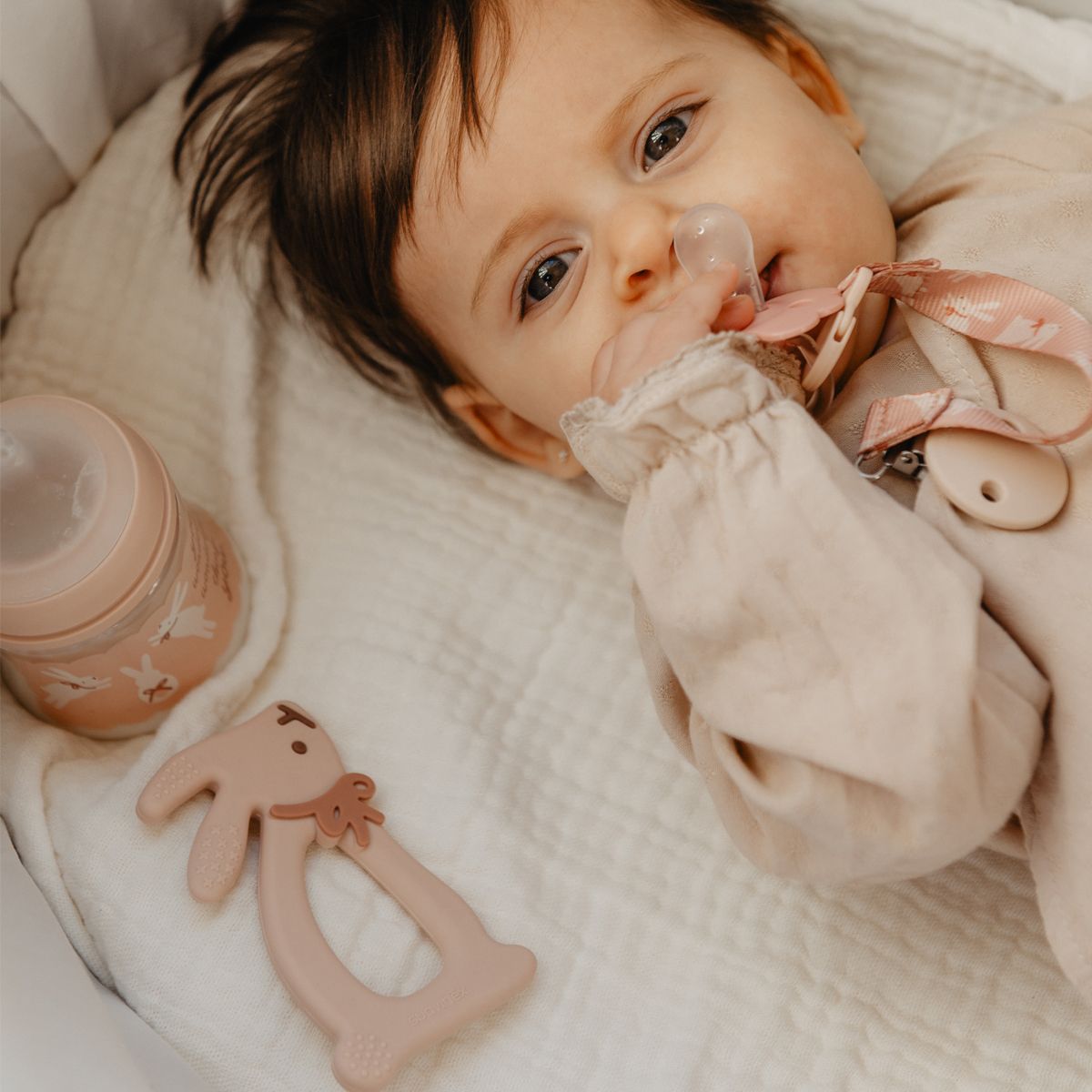 Hryzátko z potravinárskeho silikónu je vhodné pre bábätká už od narodenia. Vďaka ľahkému a kompaktnému prevedeniu sa ľahko drží aj v malých detských ručičkách.