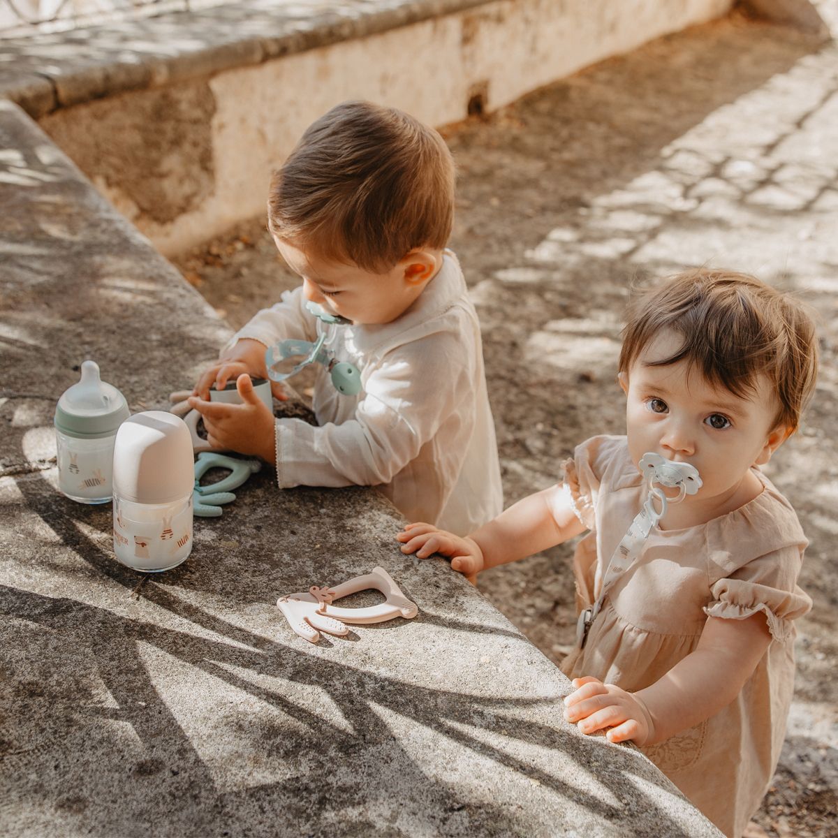 Mäkký a flexibilný silikón je šetrný k citlivým ďasnám, zatiaľ čo jemné výstupky pomáhajú uľaviť pri prerezávaní zúbkov a zároveň podporujú rozvoj jemnej motoriky.