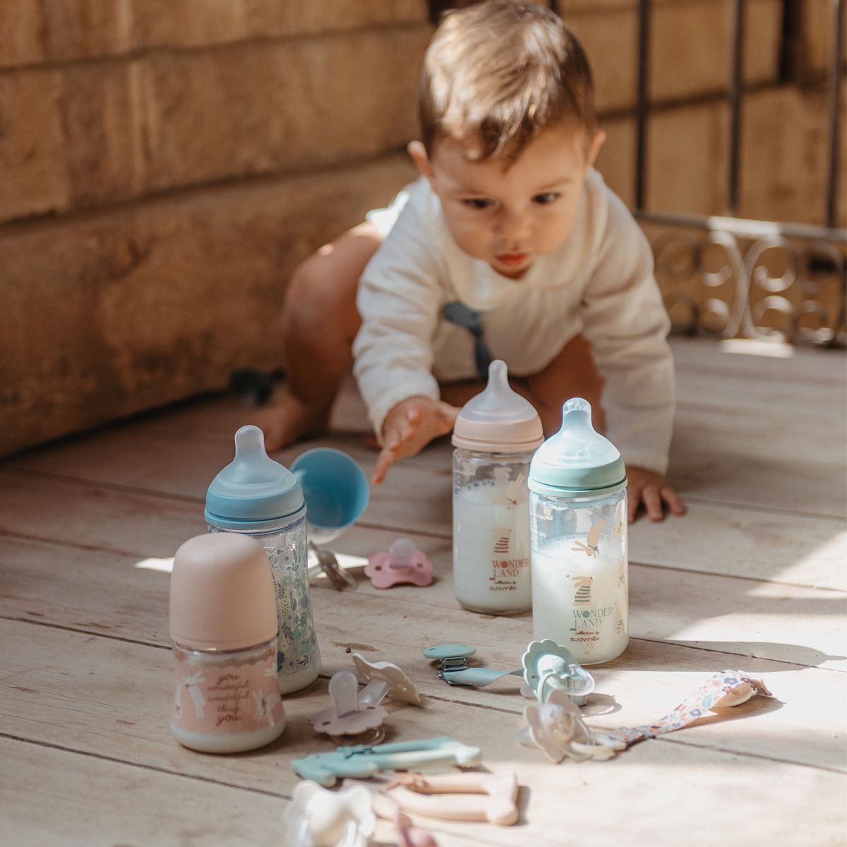 Sklenené dojčenské fľaše z kolekcie Wonderland so savičkou SX Pro s pomalým prietokom sú ideálnou voľbou pre prvé dni bábätka.