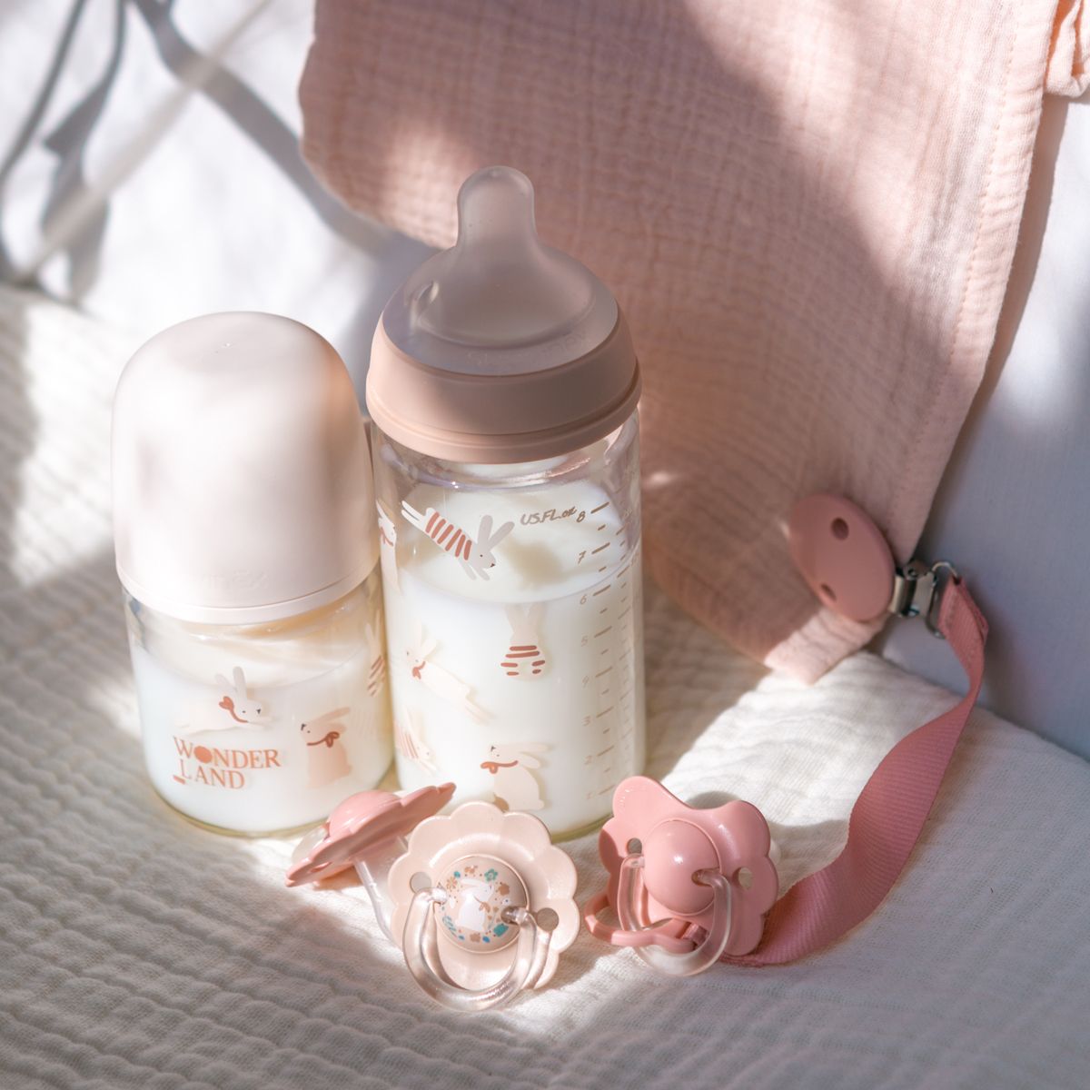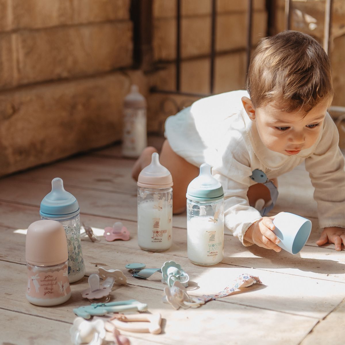 Sklenené fľaše z kolekcie Wonderland so savičkou SX Pro so stredným prietokom sú ideálnou voľbou pre každodenné kŕmenie bábätka.