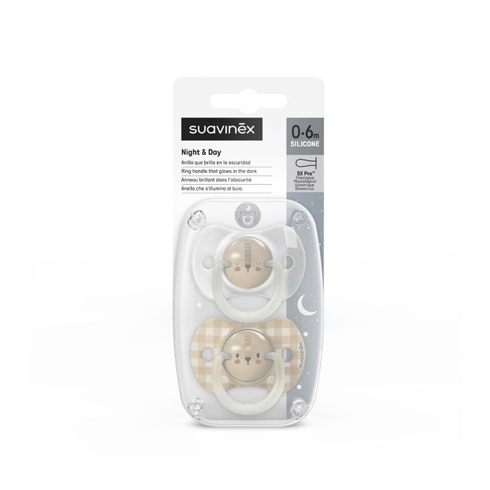 SUAVINEX | Cumlík DEŇ&NOC fyziologický silikón 0-6 m 2ks - krémový lev
