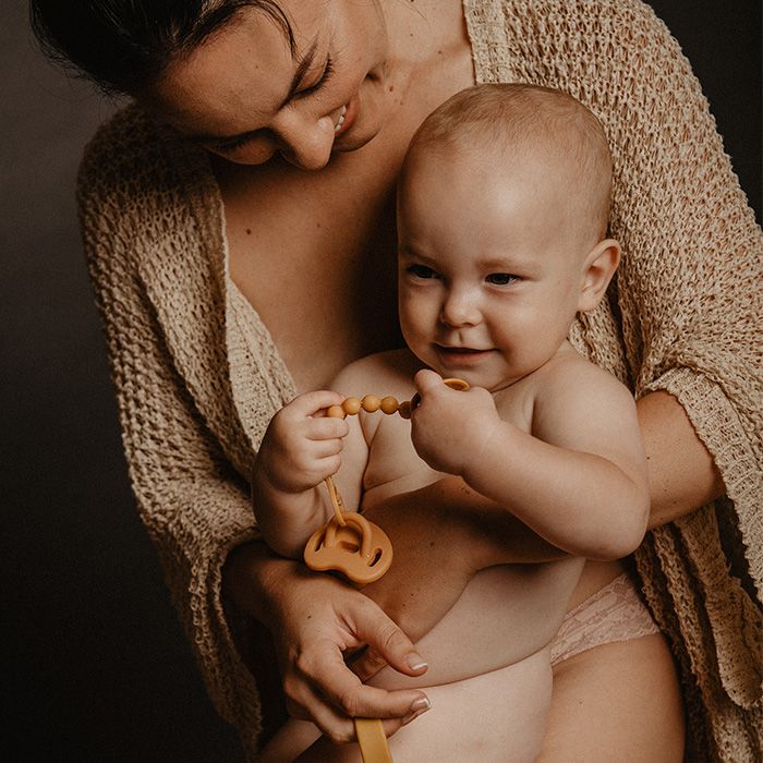 Krásny a praktický klip umožňuje upevniť cumlík na oblečenie dieťaťa a predchádza jeho prípadnému spadnutiu na nečistú zem alebo jeho strate.