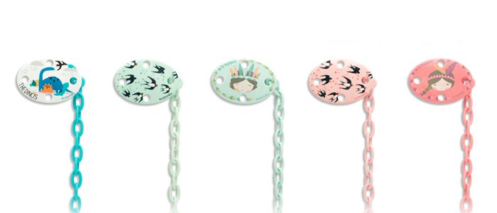 Oválný klip s veselými obrázky a řetízkem, ke kterému pohodlně připnete dudlík.
