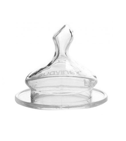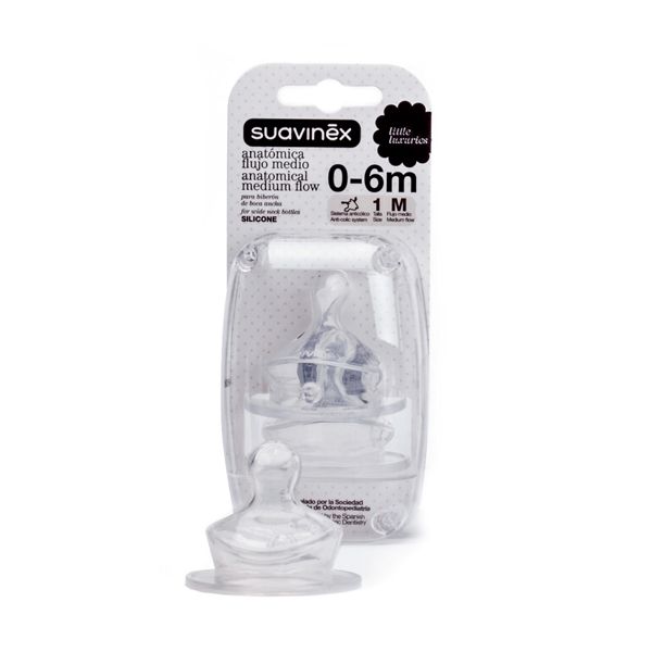 Pri výrobkoch Suavinex máte tiež možnosť voľby materiálu náhradných cumlíkov - latexové/silikónové a možnosť výberu veľkosti prietoku náhradného cumlíka - S, M a L (od najmenšieho po najväčšie).